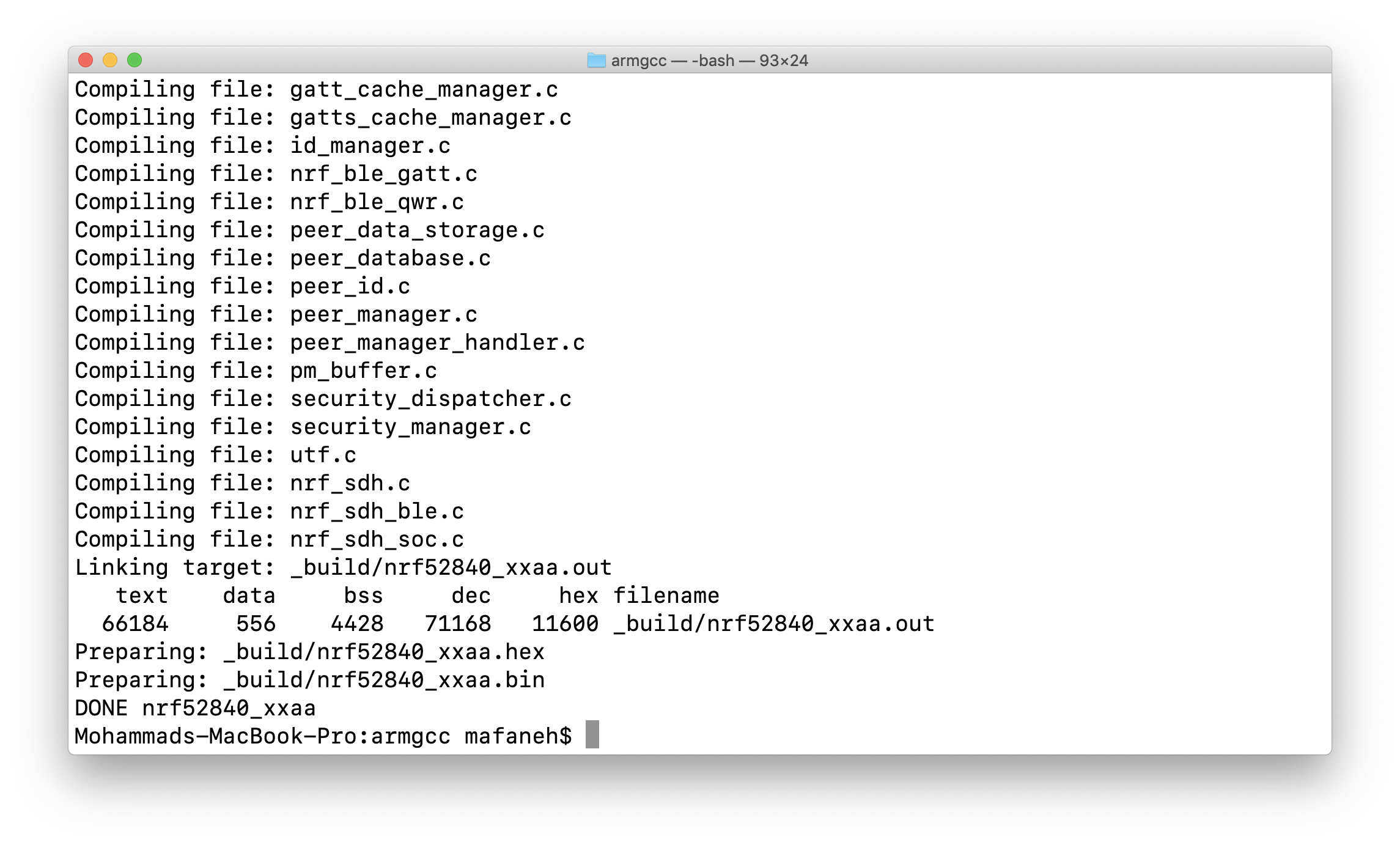 Makefile.posixfile to point to the correct location and version of the armgcc compiler. Edit the file located at<nRF5 SDK Folder>/components/toolchain/gcc/Makefile.posix:GNU_INSTALL_ROOT ?= <Toolchain Folder>/gcc-arm-none-eabi-7-2017-q4-major/bin/ GNU_VERSION ?= 7.2.1 GNU_PREFIX ?= arm-none-eabiMake sure you replace