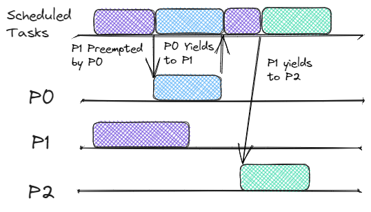 We’re all familiar with Preemptive scheduling. This is the type of scheduling used in most RTOS, as well as the most prominent operating systems like Linux, Windows, and MacOS. At a high level preemptive schedulers can stop the execution of a task at any time it sees fit. Generally, there is a concept of priority, and the OS kernel will favor higher-priority threads when determining which threads to run while attempting to allow all tasks to run.