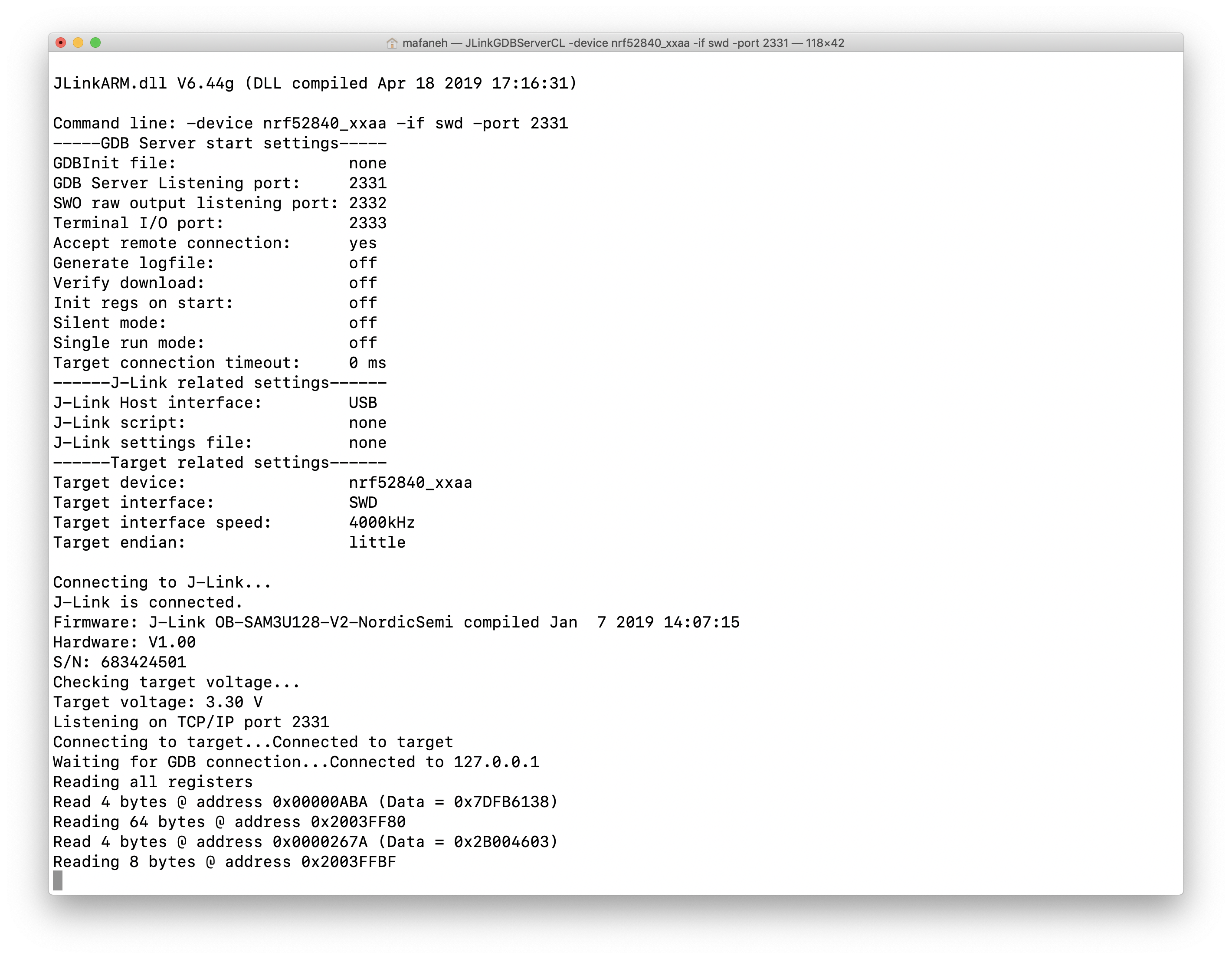 $ JLinkGDBServerCL -device nrf52840_xxaa -if swd -port 2331