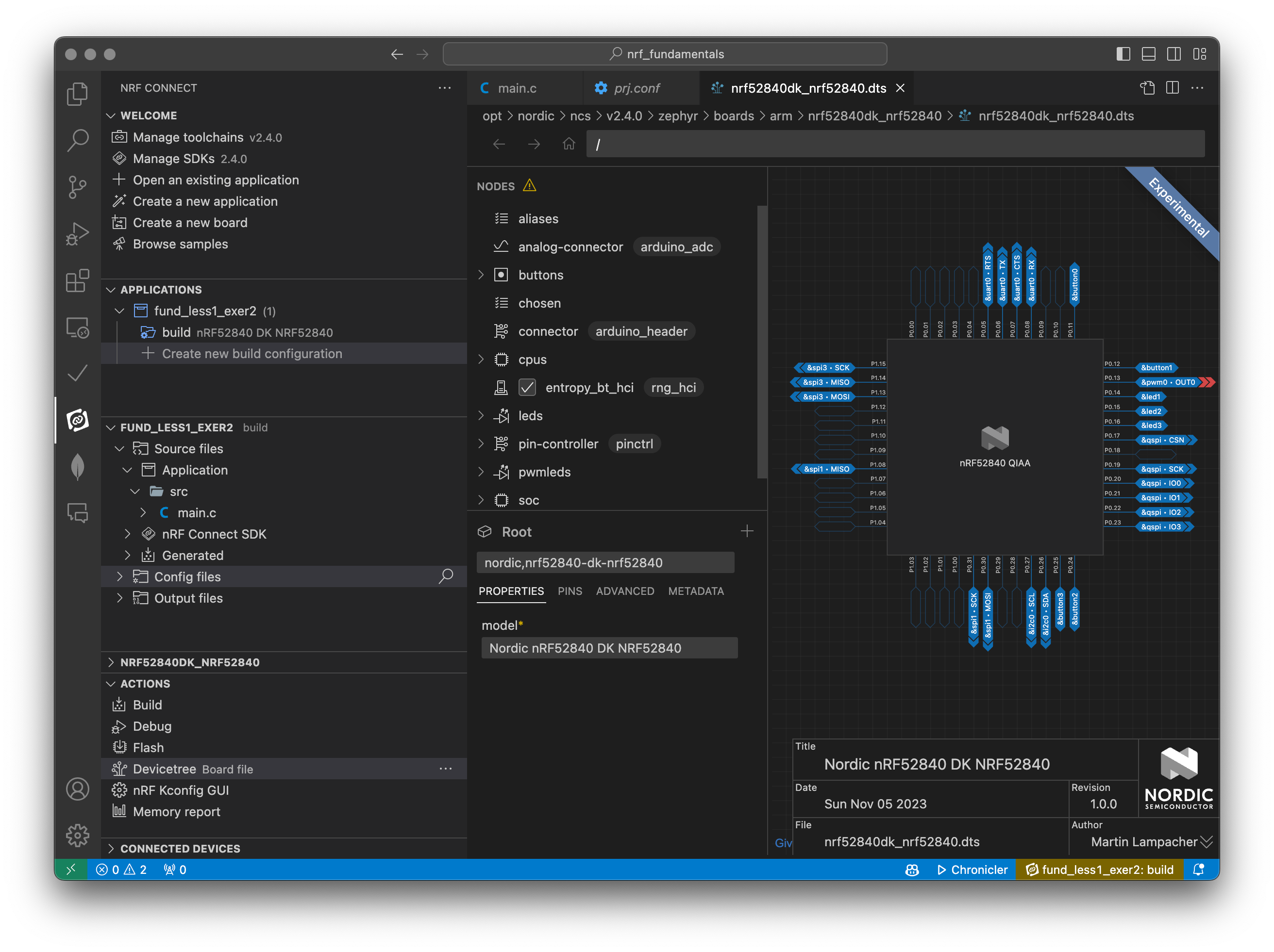 If you like VS Code and use Nordic’s MCUs, you can also have a look at their extension pack, which comes with a graphical devicetree and KConfig extension, debugging support, and much more: